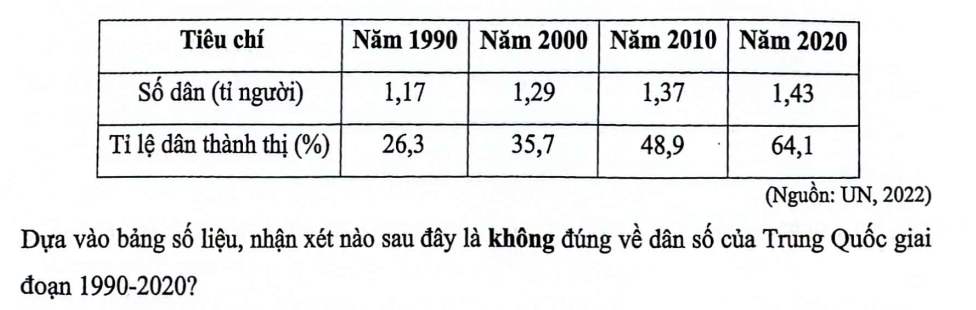 - D. Tỉ lệ dân nông thôn Trung Quốc giảm liên tục trong giai đoạn 1990-2020