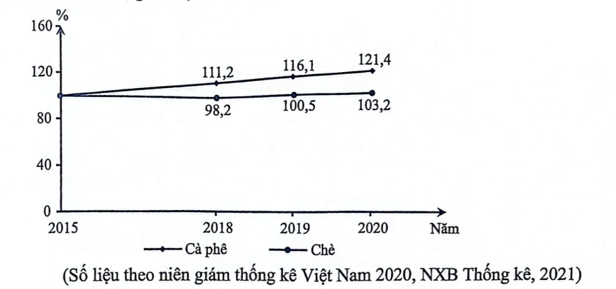 Biểu đồ dưới đây thể hiện nội dung nào về sản lượng một số cây công nghiệp lâu năm của nước ta, giai đoạn 2015 - 2020?