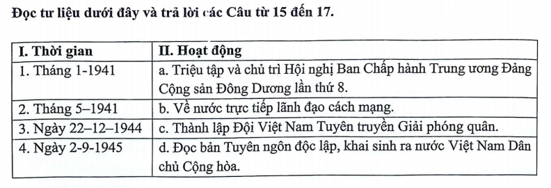 15. Phương án nào sau đây phản ánh đúng thời gian và hoạt động của Nguyễn Ái Quốc trong những năm 1941 - 1945?