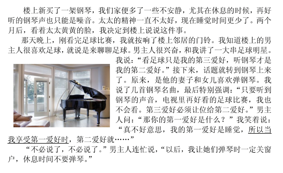 一个姑娘和一个小伙子结婚了, 他们结婚以后的生活十分幸福。小伙子非常喜欢足球, 每次电视中有足球比赛的时候, 他连饭都不吃也要看。对此, 年轻的妻子一点儿 4_____ 也没有。一天, 电视里又播放足球比赛, 丈夫坐在电视机前一动也不动, 妻子跟他说话他也 5______ 没有听到。年轻的妻子非常 6_____, 她哭着回到自己的妈妈家, 可是回到家的时候却发现家里只有爸爸一个人, 也坐在电视机前看足球比赛。“7_____” 她很奇怪。“回她的妈妈家了。” 父亲头也不回地说。