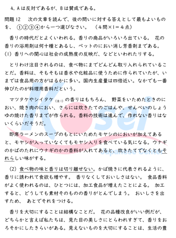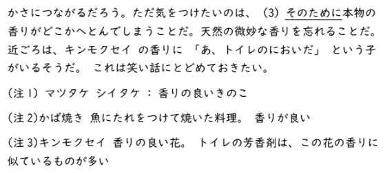 - C. 香りのように目に見えないものを大切にするのはとてもいいことだが、それらをすべて人工の香料に頼るのではなく、天然の香りも大切にしたい。