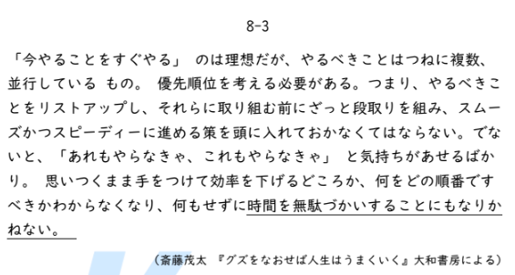 - D. 優先順位を考えて行動しないと、結果的に何も手につかなくなるから。