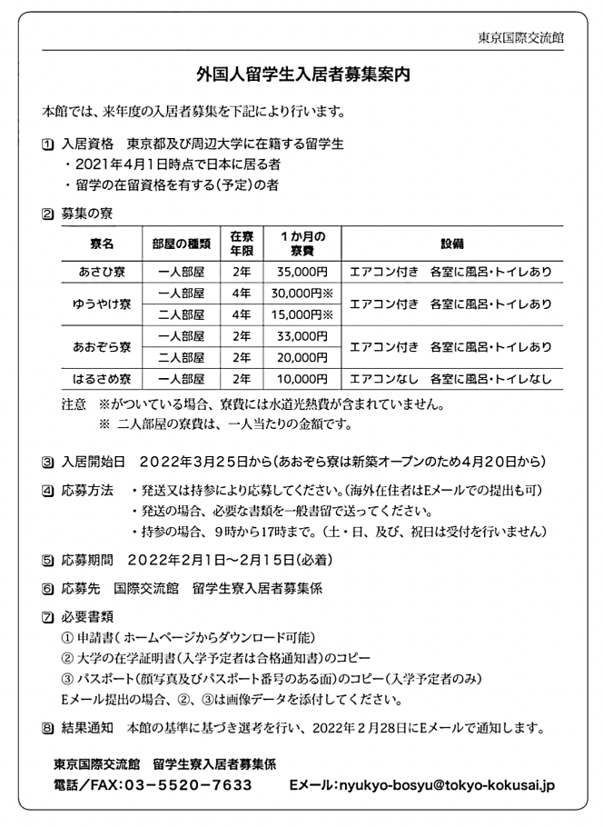 問題14 右のページは、あるホームページに載っている留学生寮の入居者募集案内である。下の問いに対する答えとして最もよいものを、1・2・3・4から一つ選びなさい。(2問×4点=8点)