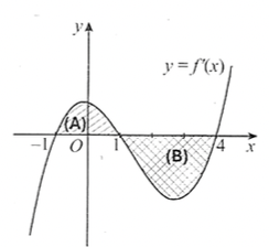 Câu 2: Cho hàm số $y = f(x)$ là hàm đa thức có đồ thị của hàm số $y = f'(x)$ như hình dưới đây. Biết $f(-1) = -\frac{35}{3}$, diện tích hình phẳng $(A), (B)$ lần lượt bằng $\frac{64}{3}$ và 63.
