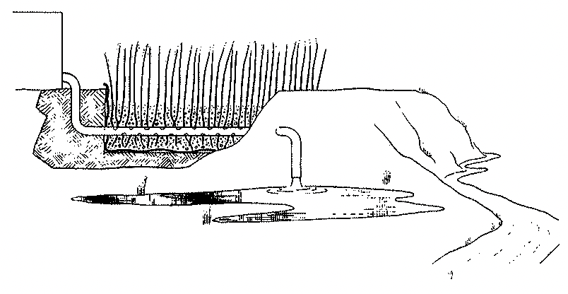 Sewage flows (33) from tank into reed bed.