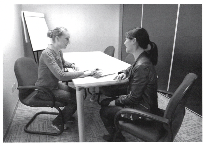 Statement (C), "They're sitting at a table," is the best description of the picture, so you should select answer (C) and mark it on your answer sheet.