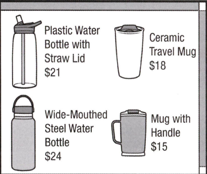 Graphic shows four drink containers with prices: Plastic Water Bottle with Straw Lid $21, Ceramic Travel Mug $18, Wide-Mouthed Steel Water Bottle $24, Mug with Handle $15.
