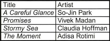 Graphic shows a table with artwork titles and artists: A Careful Glance (So-Jin Park), Promises (Vivek Madan), Stormy Sea (Claudia Hoffman), The Moment (Adisa Rotimi). "Stormy Sea" and "The Moment" are highlighted or checked.