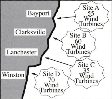 Graphic shows a map with four locations (Bayport, Clarksville, Lancaster, Winston) and four wind turbine sites (Site A: 55, Site B: 60, Site C: 55, Site D: 70).