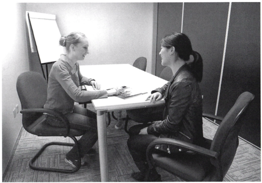 Statement (C), "They're sitting at a table," is the best description of the picture, so you should select answer (C) and mark it on your answer sheet.