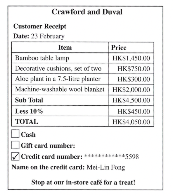 Attached is the receipt you requested. In apology for the inconvenience, we will provide you with 10 percent off the total price of your next order. To view a full description of any previous order, first log in to your account on our Web site, go to the "My Orders" tab, and then click on any order number.