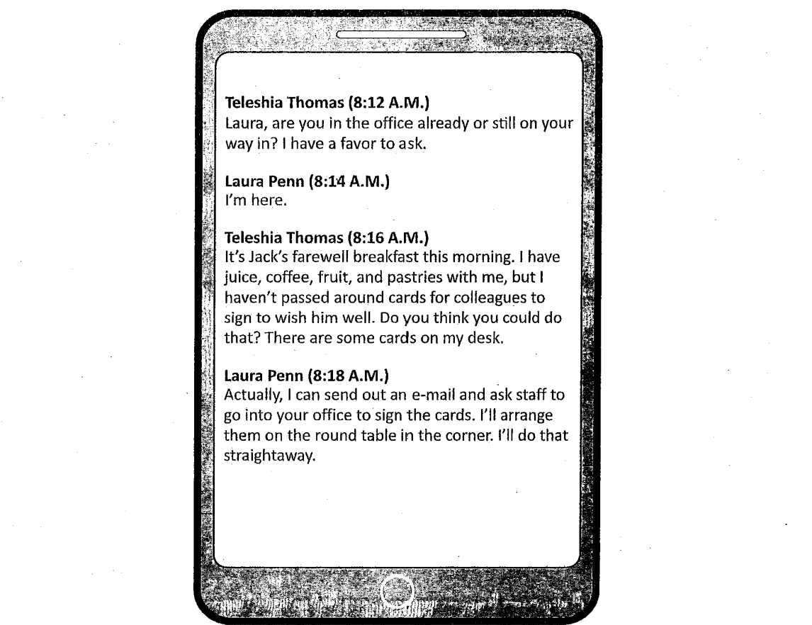 At 8:14 A.M., what does Ms. Penn most likely mean when she writes, "I'm here"?