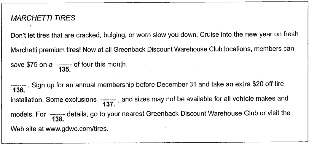 Directions: Read the texts that follow. A word, phrase, or sentence is missing in parts of each text. Four answer choices for each question are given below the text. Select the best answer to complete the text. Then mark the letter (A), (B), (C), or (D) on your answer sheet.