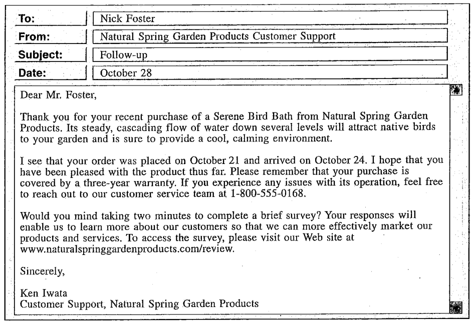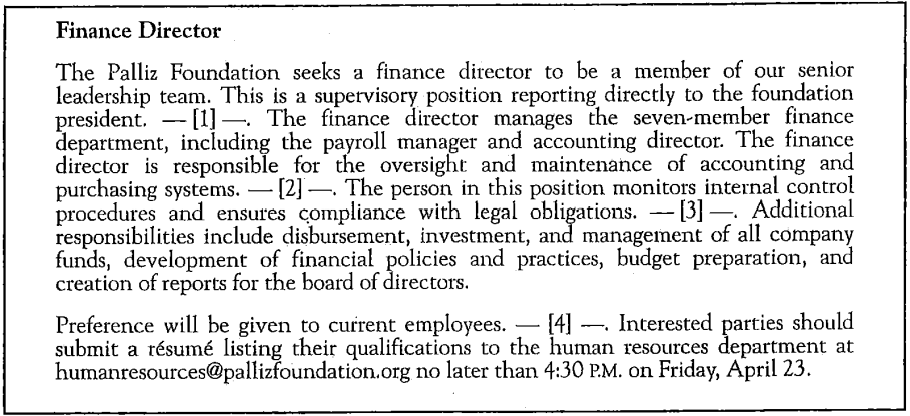 Directions: In this part you will read a selection of texts, such as magazine and newspaper articles, e-mails, and instant messages. Each text or set of texts is followed by several questions. Select the best answer for each question and mark the letter (A), (B), (C), or (D) on your answer sheet.