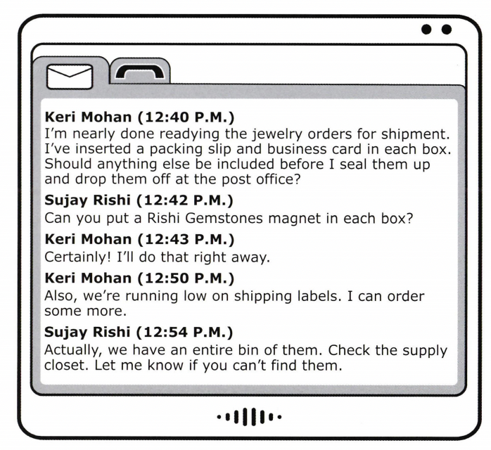 At 12:54 P.M., what does Mr. Rishi most likely mean when he writes, "Actually, we have an entire bin of them"?