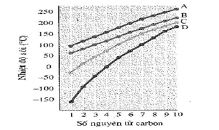 Câu 3. Đồ thị hình bên mô tả sự phụ thuộc giá trị nhiệt độ sôi vào số nguyên tử carbon của bốn loại hợp chất alkane, alcohol, aldehyde và carboxylic acid. Đồ thị A, B, C, D lần lượt tương ứng với các loại hợp chất là: