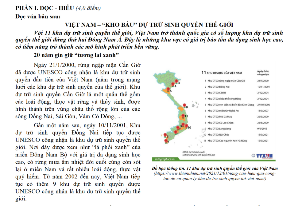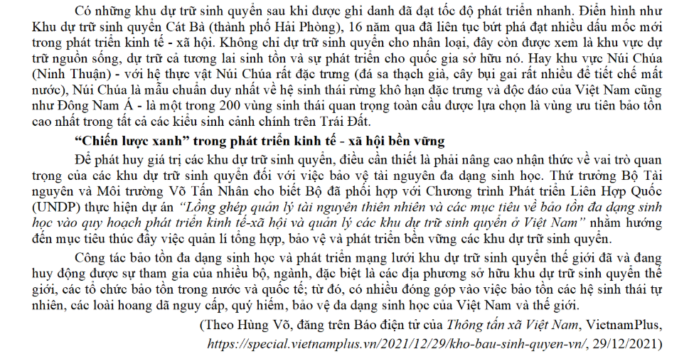 Câu 5 (1,0 điểm): Thông tin nào về vai trò của khu dự trữ sinh quyển trong văn bản anh/ chị ấn tượng hơn cả? Lí giải.