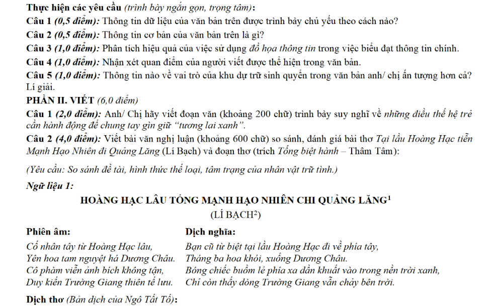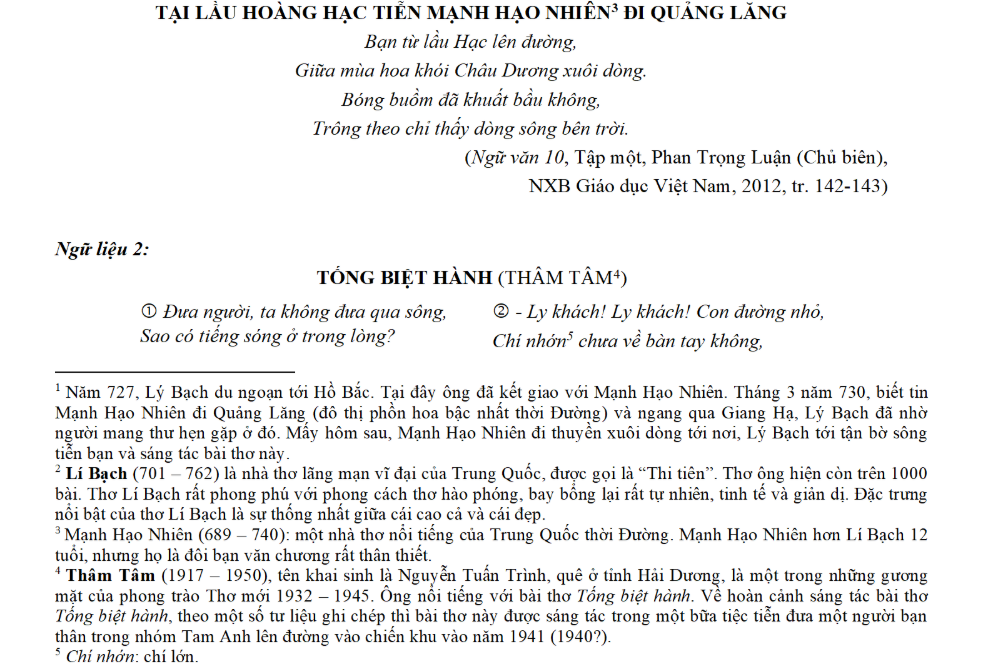 Câu 2 (4,0 điểm): Viết bài văn nghị luận (khoảng 600 chữ) so sánh, đánh giá bài thơ Tại lầu Hoàng Hạc tiễn Mạnh Hạo Nhiên đi Quảng Lăng (Lí Bạch) và đoạn thơ (trích Tống biệt hành – Thâm Tâm):