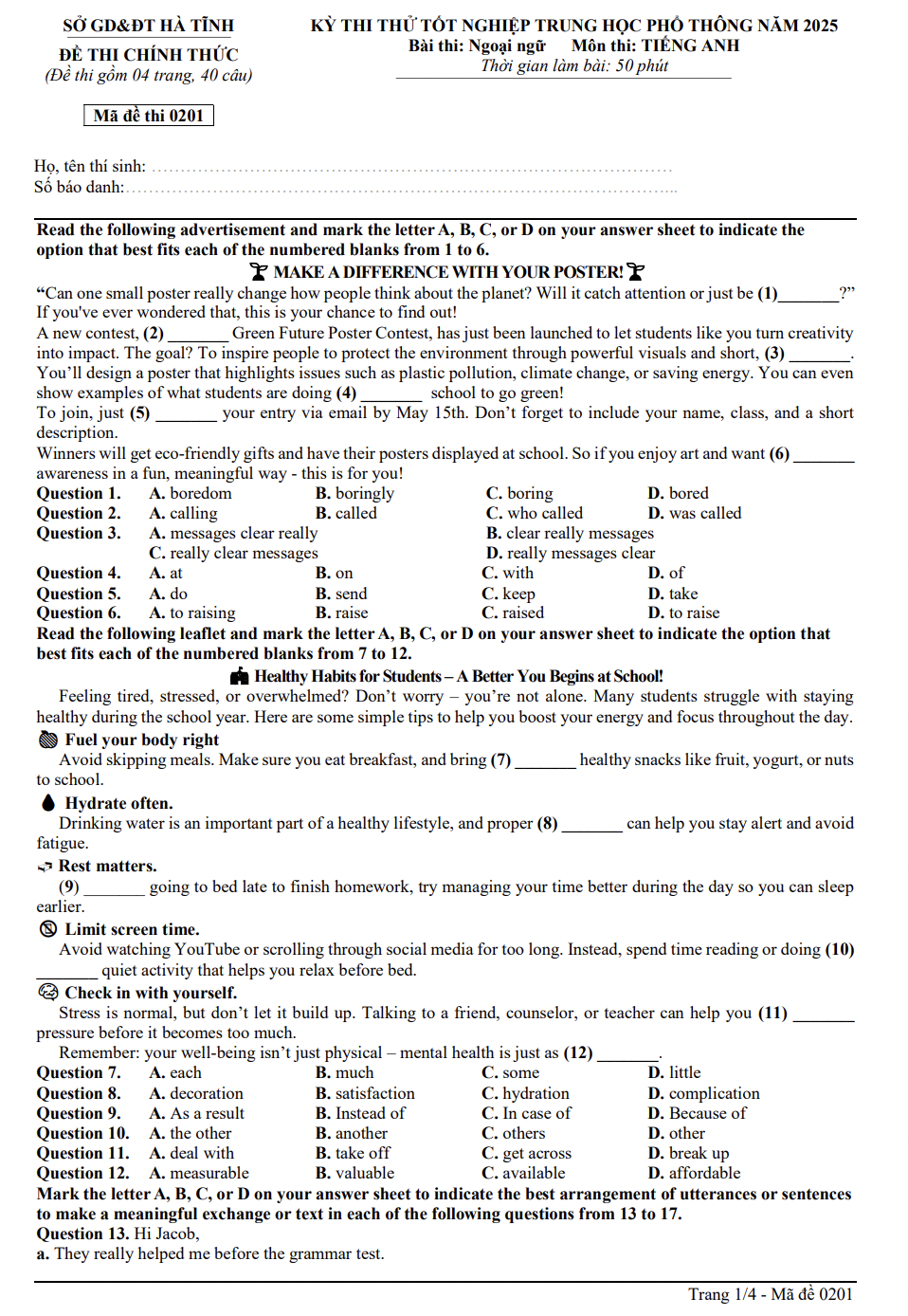 Đề thi thử Đại học 2025 môn Tiếng Anh – Sở GD&ĐT Hà Tĩnh là một trong những đề tiêu biểu thuộc đề thi thử Tiếng Anh THPT QG, nằm trong chương trình Đề thi vào Đại học. Đây là đề thi do Sở Giáo dục và Đào tạo tỉnh Hà Tĩnh tổ chức, nhằm hỗ trợ học sinh lớp 12 trên toàn tỉnh ôn luyện hiệu quả và làm quen với cấu trúc đề thi chính thức của kỳ thi Tốt nghiệp THPT Quốc gia năm 2025.