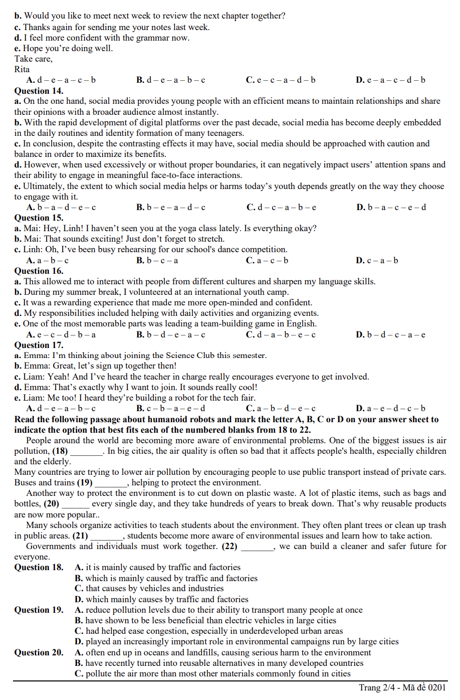 Mark the letter A, B, C, or D on your answer sheet to indicate the best arrangement of utterances or sentences to make a meaningful exchange or text in each of the following questions from 13 to 17.
