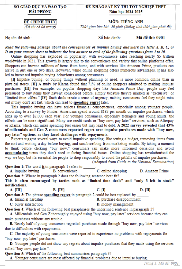 Đề thi thử Đại học 2025 môn Tiếng Anh – Sở GD&ĐT Hải Phòng là một trong những đề tiêu biểu thuộc thi thử môn Tiếng Anh THPT QG, nằm trong chương trình Đề thi vào Đại học. Được biên soạn và tổ chức bởi Sở Giáo dục và Đào tạo thành phố Hải Phòng, đề thi nhằm mục tiêu giúp học sinh lớp 12 trên địa bàn kiểm tra năng lực và làm quen với định dạng đề thi chính thức của kỳ thi Tốt nghiệp THPT Quốc gia năm 2025.