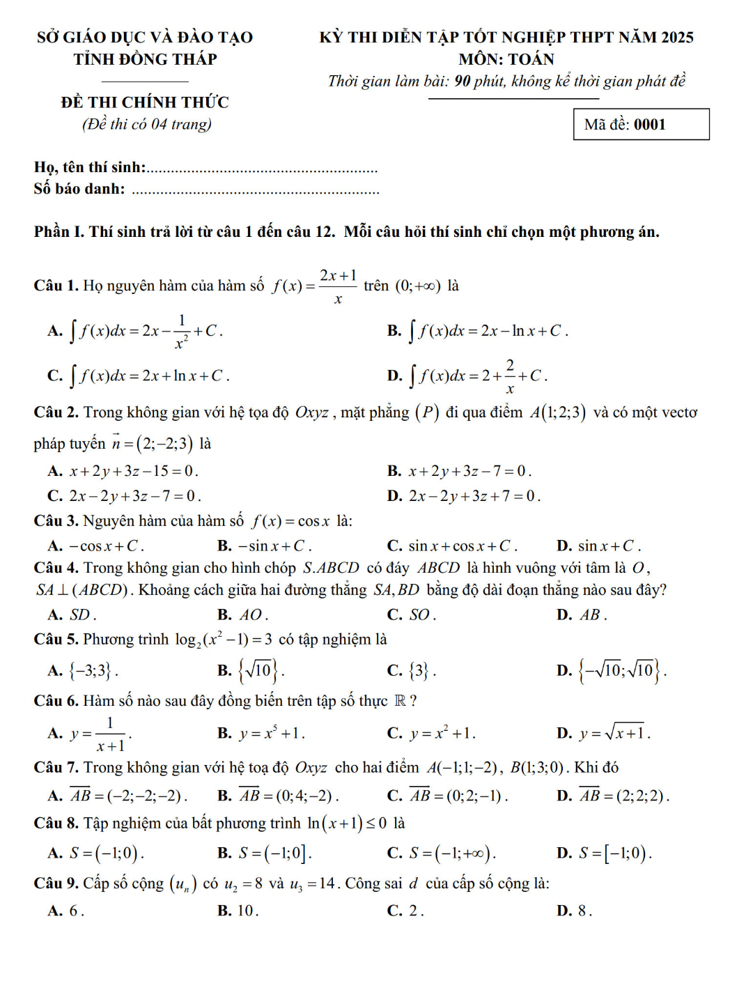 Đề thi thử đại học môn Toán 2025 – Sở GDĐT Đồng Tháp là một trong những đề thi chất lượng nằm trong nhóm Thi thử Toán THPT thuộc chương trình thi thử Đại học. Đây là tài liệu hữu ích cho quá trình thi chuyển cấp, giúp học sinh lớp 12 làm quen với cấu trúc đề thi chuẩn, luyện tập kỹ năng giải nhanh và nâng cao năng lực tư duy toán học trước kỳ thi tốt nghiệp THPT Quốc gia năm 2025.