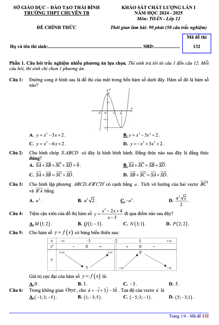 Đề thi thử đại học môn Toán 2025 – THPT Chuyên Thái Bình (Sở GDĐT Thái Bình) – Lần 1