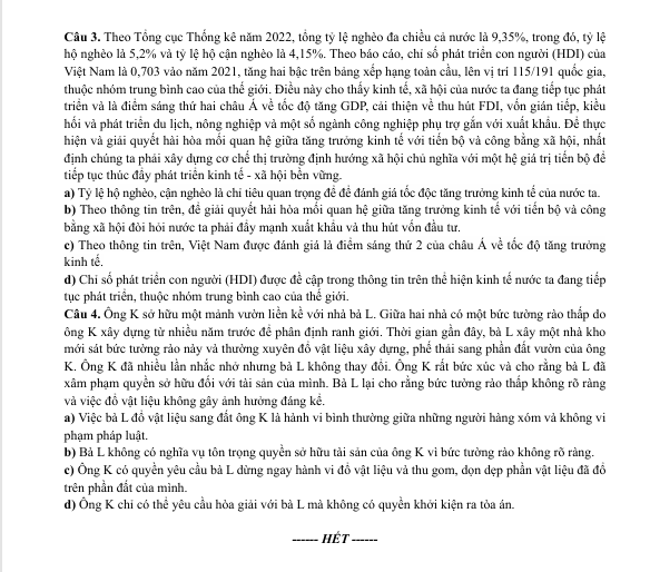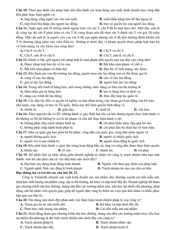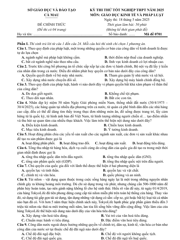 Đề Thi Thử Kinh Tế Pháp Luật THPT 2025 – Sở GDĐT Cà Mau là tài liệu ôn luyện thuộc môn Kinh tế và Pháp luật dành cho học sinh lớp 12 đang chuẩn bị cho kỳ thi tốt nghiệp THPT. Đây là đề tham khảo được xây dựng theo định hướng chương trình giáo dục phổ thông mới, giúp học sinh củng cố các kiến thức trọng tâm như quy luật của nền kinh tế thị trường, vai trò của Nhà nước, quyền và nghĩa vụ công dân và các tình huống pháp lý trong đời sống. Đề thi được biên soạn bởi cô Nguyễn Thị Mỹ Hạnh – giáo viên môn Giáo dục Kinh tế và Pháp luật tại Trường THPT Chuyên Phan Ngọc Hiển (Cà Mau) vào năm 2025, với hệ thống câu hỏi bám sát chương trình học và xu hướng ra đề hiện nay.