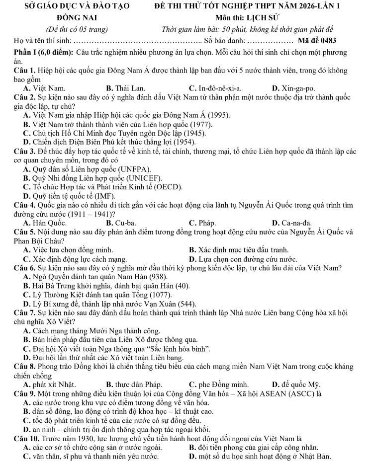 Đề thi thử Lịch sử THPT 2026 – Sở GDĐT Đồng Nai (Lần 1)