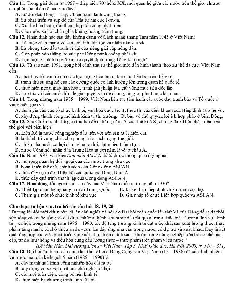 Câu 13. Từ sau năm 1991, trong bối cảnh trật tự thế giới mới dần hình thành theo xu thế đa cực, Việt Nam cần