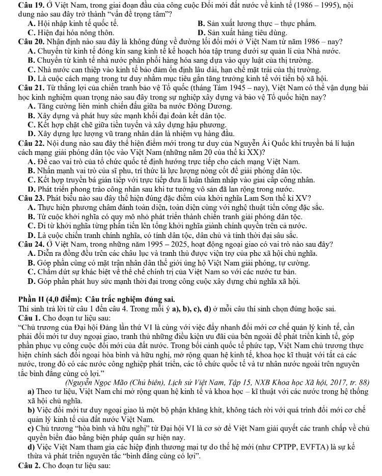 Câu 19. Ở Việt Nam, trong giai đoạn đầu của công cuộc Đổi mới đất nước về kinh tế (1986 – 1995), nội dung nào sau đây trở thành “vấn đề trọng tâm”?