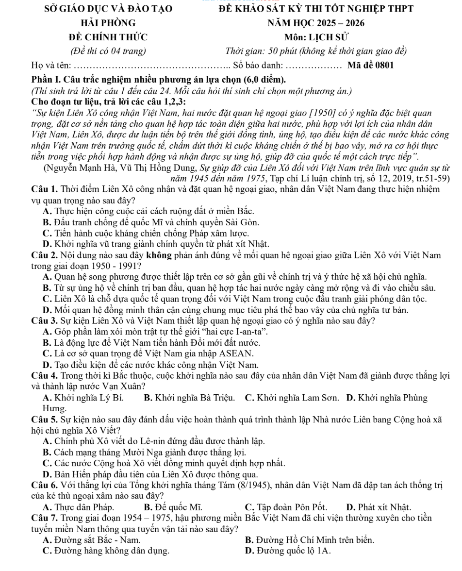 Đề thi thử Lịch sử THPT 2026 – Sở GDĐT Hải Phòng