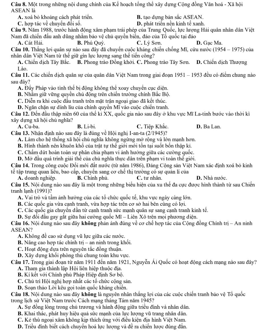 Câu 10. Thắng lợi quân sự nào sau đây đã chuyển cuộc kháng chiến chống Mĩ, cứu nước (1954 – 1975) của nhân dân Việt Nam từ thế giữ gìn lực lượng sang thế tiến công?