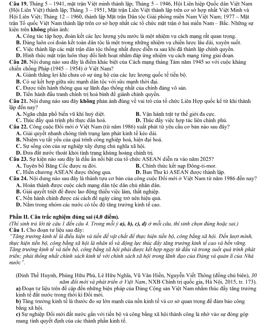 Câu 24. Nội dung nào sau đây là thành tựu cơ bản của công cuộc Đổi mới ở Việt Nam từ năm 1986 đến nay?