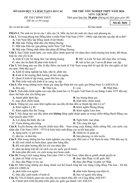 Đề Thi Thử Lịch Sử THPT 2026 – Sở GDĐT Lào Cai là tài liệu ôn luyện thuộc môn Lịch Sử dành cho học sinh lớp 12 đang chuẩn bị cho kỳ thi tốt nghiệp THPT. Đây là đề tham khảo thi Đại học được xây dựng theo định hướng cấu trúc đề minh họa của Bộ Giáo dục và Đào tạo, giúp học sinh củng cố các chuyên đề quan trọng như lịch sử Việt Nam giai đoạn 1919–2000, lịch sử thế giới hiện đại, các cuộc kháng chiến tiêu biểu và công cuộc đổi mới đất nước. Đề thi được biên soạn bởi thầy Nguyễn Văn Hùng – giáo viên Lịch Sử tại Trường THPT Chuyên Lào Cai (Lào Cai) vào năm 2026, với hệ thống câu hỏi bám sát chương trình học và xu hướng ra đề hiện nay.