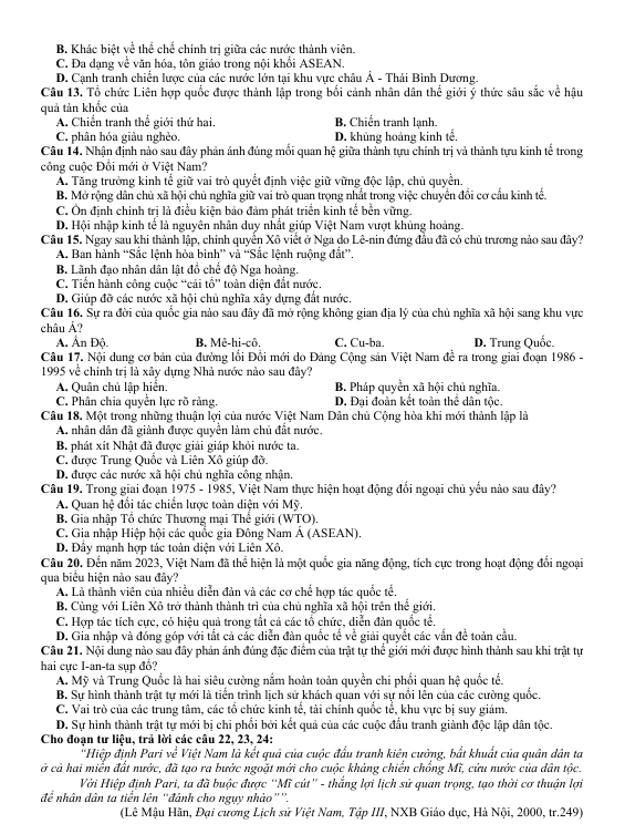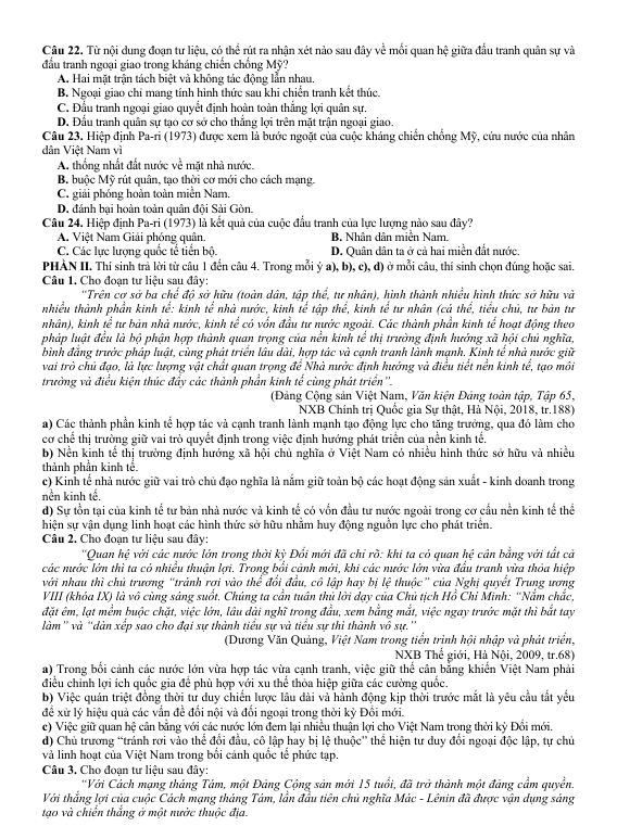 Câu 22. Từ nội dung đoạn tư liệu, có thể rút ra nhận xét nào sau đây về mối quan hệ giữa đấu tranh quân sự và đấu tranh ngoại giao trong kháng chiến chống Mỹ?