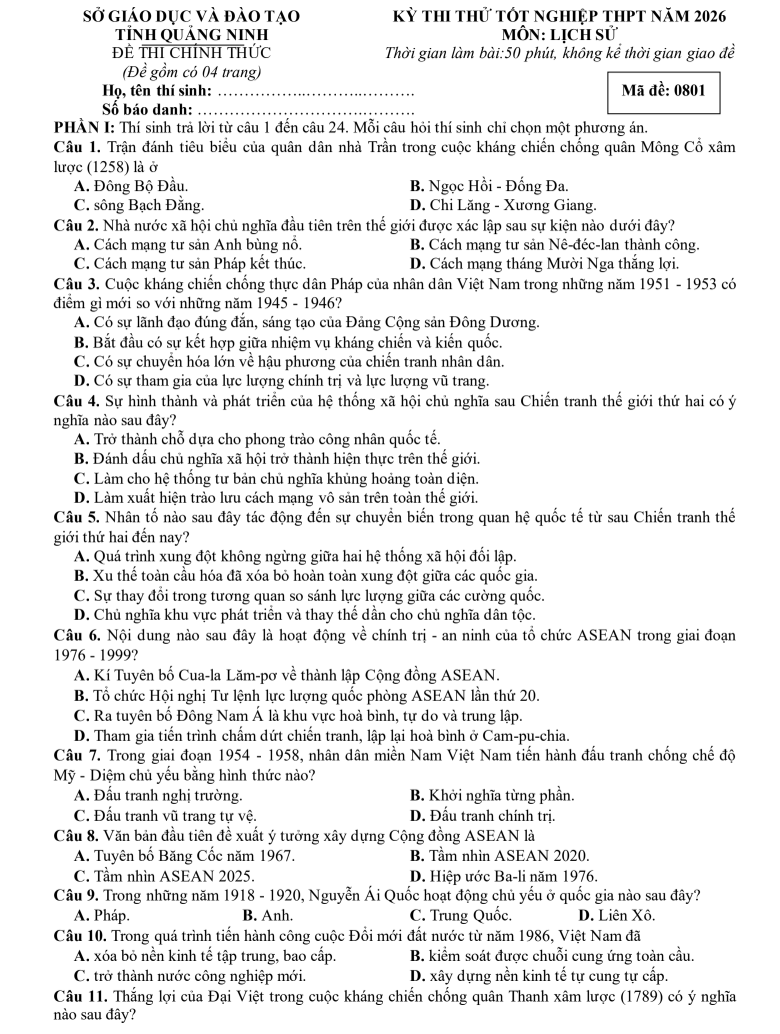 Đề thi thử Lịch sử THPT 2026 – Sở GDĐT Quảng Ninh là nguồn tài liệu ôn luyện phù hợp cho học sinh lớp 12 trong năm học 2025–2026, nhất là ở giai đoạn cần tổng hợp kiến thức để chuẩn bị cho kỳ thi tốt nghiệp THPT. Khi làm đề, học sinh không chỉ kiểm tra lại khả năng ghi nhớ các mốc thời gian và sự kiện quan trọng mà còn có điều kiện nhìn lại toàn bộ tiến trình lịch sử theo từng chủ đề lớn. Với những em đang cần đề luyện tốt nghiệp THPT Lịch sử, đây là tài liệu có ích để ôn các nội dung trọng tâm như lịch sử Việt Nam hiện đại, lịch sử thế giới, các cuộc kháng chiến, phong trào cách mạng và những vấn đề mang tính tổng hợp. Ngoài giá trị củng cố kiến thức, đề còn giúp rèn kỹ năng đối chiếu sự kiện, phân tích bối cảnh và xác định bản chất vấn đề lịch sử. Vì thế, tài liệu này cũng có thể được tiếp cận như một dạng đề thi đại học THPT dành cho học sinh muốn nâng cao tư duy hệ thống và cải thiện độ chính xác khi làm bài trắc nghiệm.