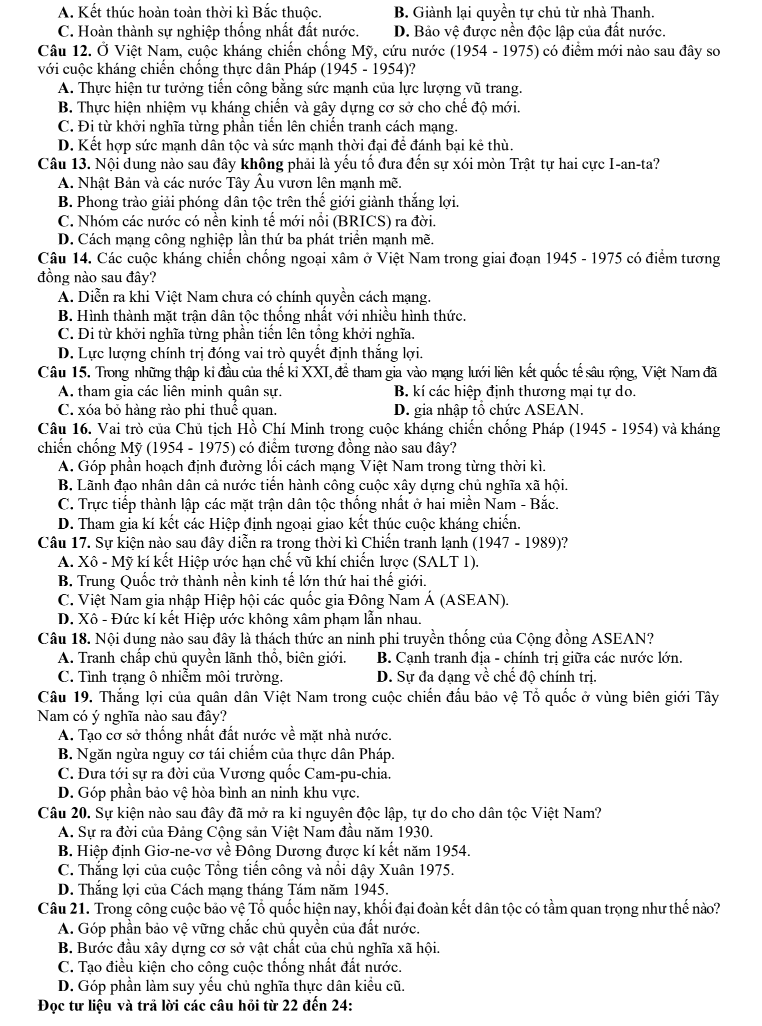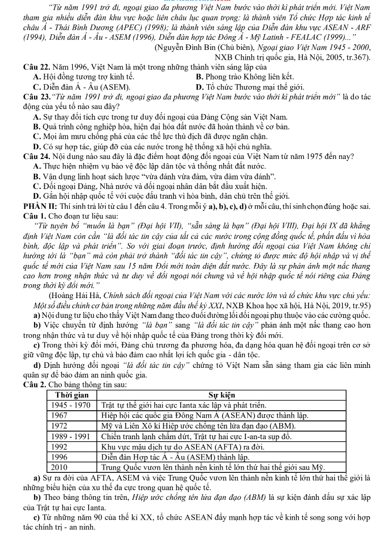 Đọc tư liệu và trả lời các câu hỏi từ 22 đến 24: