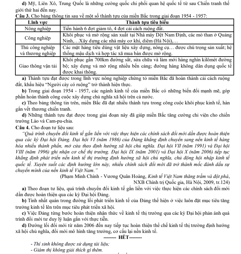 Câu 3. Cho bảng thông tin sau về một số thành tựu của miền Bắc trong giai đoạn 1954 – 1957: