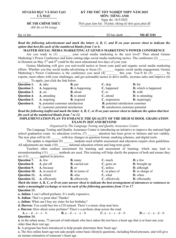 Đề Thi Thử Tiếng Anh THPT 2025 – Sở GDĐT Cà Mau là tài liệu ôn luyện thuộc môn Tiếng Anh dành cho học sinh lớp 12 đang chuẩn bị ôn thi tốt nghiệp THPT. Đây là đề tham khảo được xây dựng theo định hướng cấu trúc đề minh họa của Bộ Giáo dục và Đào tạo, giúp học sinh củng cố các chuyên đề quan trọng như ngữ pháp, từ vựng, kỹ năng đọc hiểu, tìm lỗi sai và hoàn thành câu. Đề thi được biên soạn bởi cô Trần Thị Mỹ Linh – giáo viên Tiếng Anh tại Trường THPT Chuyên Phan Ngọc Hiển (Cà Mau) vào năm 2026, với hệ thống câu hỏi bám sát chương trình học và xu hướng ra đề hiện nay.