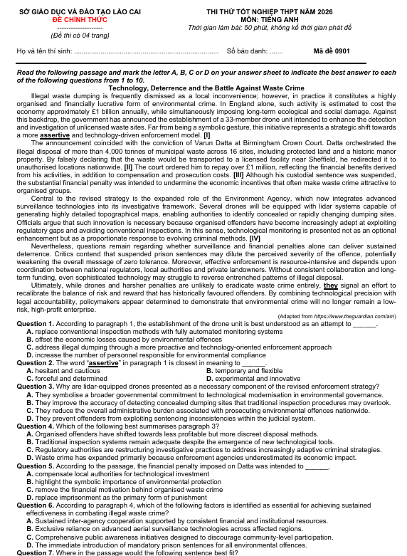 Đề thi thử Tiếng Anh THPT 2026 – Sở GDĐT Lào Cai