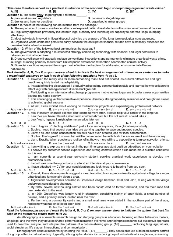 Mark the letter A, B, C or D on your answer sheet to indicate the best arrangement of utterances or sentences to make a meaningful exchange or text in each of the following questions from 11 to 15.