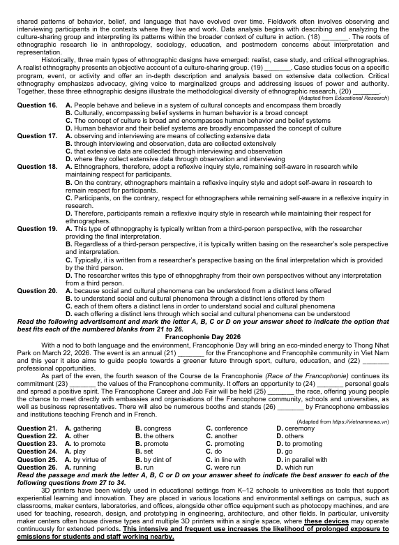 With a nod to both language and the environment, Francophonie Day will bring an eco-minded energy to Thong Nhat Park on March 22, 2026. The event is an annual (21) _______ for the Francophone and Francophile community in Viet Nam and this year it also aims to guide people towards a greener future through sport, culture, education, and (22) _______ professional opportunities.