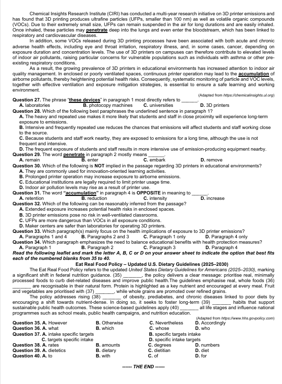 The Eat Real Food Policy refers to the updated United States Dietary Guidelines for Americans (2025–2030), marking a significant shift in federal nutrition guidance. (35) _______, the policy delivers a clear message: prioritise real, minimally processed foods to curb diet-related diseases and improve public health. The guidelines emphasise real, whole foods (36) _______ are recognisable in their natural form. Protein is highlighted as a key nutrient and encouraged at every meal. Fruit and vegetables are prioritised with (37) _______, while whole grains are promoted over refined grains.