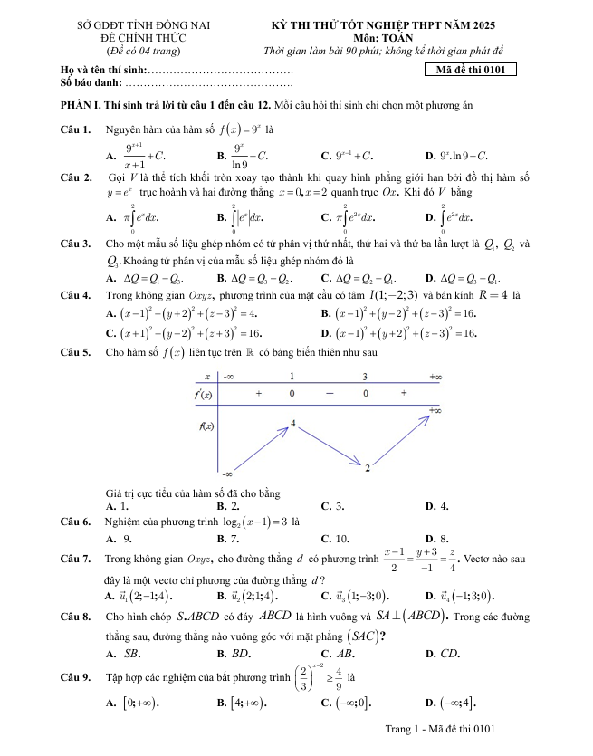 Đề Thi Thử Toán THPT 2025 – Sở GDĐT Đồng Nai là tài liệu ôn luyện thuộc môn Toán dành cho học sinh lớp 12 đang chuẩn bị cho kỳ thi tốt nghiệp THPT. Đây là đề tham khảo được xây dựng theo định hướng cấu trúc đề minh họa của Bộ Giáo dục và Đào tạo, giúp học sinh củng cố các chuyên đề quan trọng như hàm số và đồ thị, nguyên hàm – tích phân, số phức, hình học không gian và các bài toán vận dụng thực tiễn. Đề thi được biên soạn bởi thầy Nguyễn Thanh Bình – giáo viên Toán tại Trường THPT Trấn Biên (Đồng Nai) vào năm 2025, với hệ thống câu hỏi bám sát chương trình học và xu hướng ra đề hiện nay.