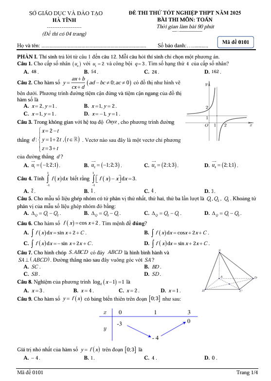 Đề Thi Thử Toán THPT 2025 – Sở GDĐT Hà Tĩnh là tài liệu ôn luyện thuộc môn Toán dành cho học sinh lớp 12 đang chuẩn bị ôn thi tốt nghiệp THPT. Đây là đề tham khảo được xây dựng theo định hướng cấu trúc đề minh họa của Bộ Giáo dục và Đào tạo, giúp học sinh củng cố các chuyên đề quan trọng như hàm số và đồ thị, nguyên hàm – tích phân, số phức, hình học không gian và các bài toán vận dụng thực tiễn. Đề thi được biên soạn bởi thầy Trần Văn Dũng – giáo viên Toán tại Trường THPT Chuyên Hà Tĩnh (Hà Tĩnh) vào năm 2025 nhằm hỗ trợ học sinh rèn luyện kỹ năng tư duy logic và giải nhanh các dạng bài trắc nghiệm.