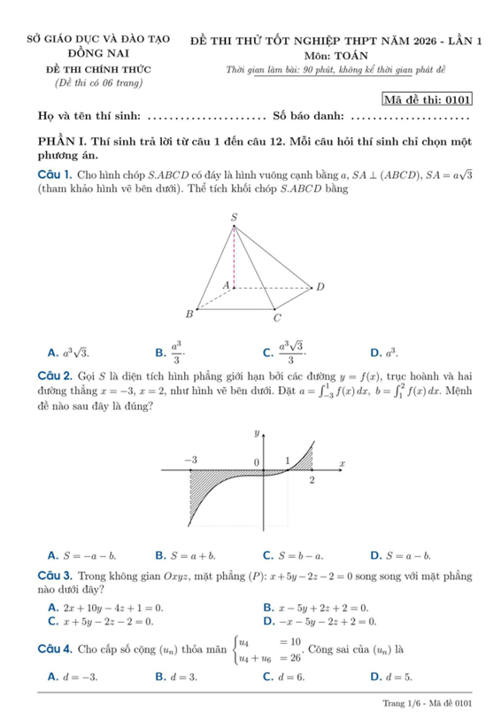 Đề Thi Thử Toán THPT 2026 – Sở GDĐT Đồng Nai là tài liệu ôn luyện thuộc môn Toán dành cho học sinh lớp 12 đang chuẩn bị cho kỳ thi tốt nghiệp THPT. Đây là đề thi tốt nghiệp THPT được định hướng theo cấu trúc đề minh họa của Bộ Giáo dục và Đào tạo, giúp học sinh củng cố các chuyên đề quan trọng như hàm số và đồ thị, nguyên hàm – tích phân, số phức, hình học không gian và các bài toán vận dụng thực tiễn. Đề thi được biên soạn bởi thầy Lê Minh Đức – giáo viên Toán tại Trường THPT Trấn Biên (Đồng Nai) vào năm 2026, với hệ thống câu hỏi bám sát chương trình học và xu hướng ra đề hiện nay.