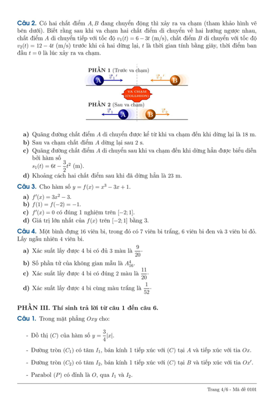 Câu 2. Có hai chất điểm A, B đang chuyển động thì xảy ra va chạm. Biết rằng sau khi va chạm hai chất điểm di chuyển về hai hướng ngược nhau, chất điểm A di chuyển tiếp với tốc độ v1(t) = 6 – 3t (m/s), chất điểm B di chuyển với tốc độ v2(t) = 12 – 4t (m/s) trước khi cả hai dừng lại, t là thời gian tính bằng giây, thời điểm ban đầu t = 0 là lúc xảy ra va chạm.
