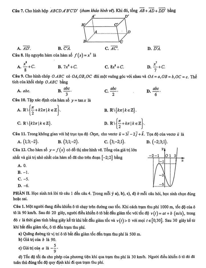 Câu 1. Một người đang điều khiển ô tô chạy trên đường cao tốc. Khi cách trạm thu phí 1000 m, tốc độ của ô tô là 90 km/h. Sau đó 20 giây, người điều khiển ô tô bắt đầu giảm tốc với tốc độ v(t) = at + b (m/s), trong đó t là thời gian tính bằng giây kể từ khi bắt đầu giảm tốc và v(t) lớn hơn 0 với mọi t thuộc [0; 30]. Sau 30 giây kể từ khi bắt đầu giảm tốc, ô tô đến trạm thu phí.