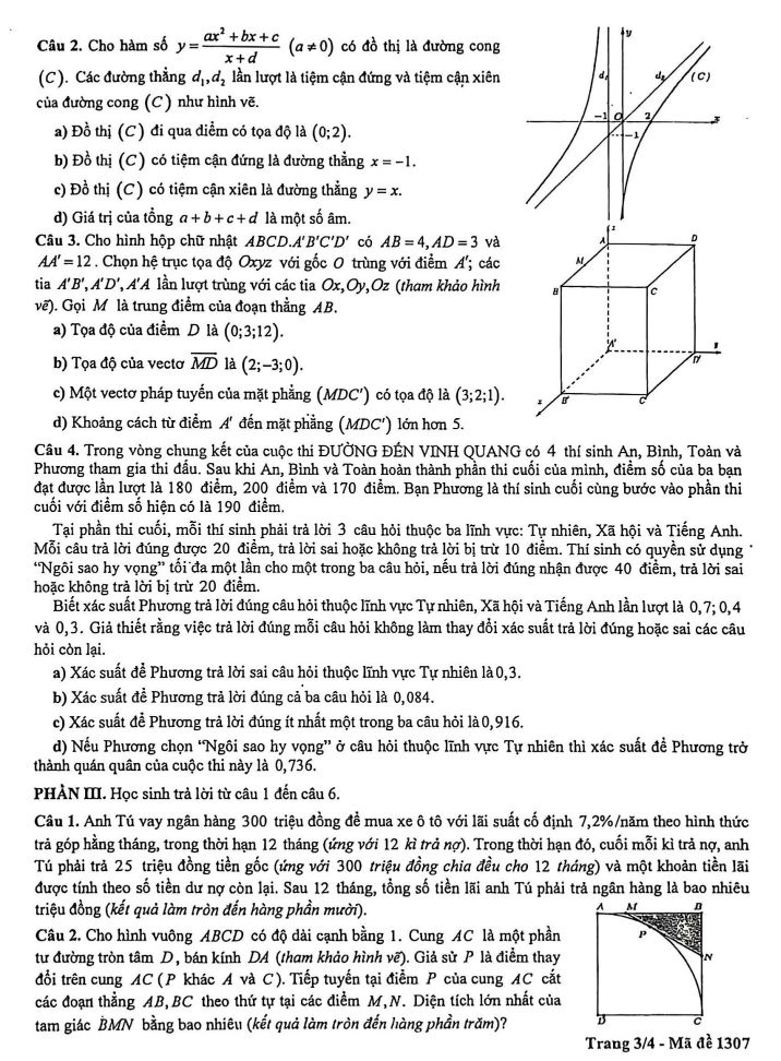 Câu 1. Anh Tú vay ngân hàng 300 triệu đồng để mua xe ô tô với lãi suất cố định 7,2%/năm theo hình thức trả góp hằng tháng, trong thời hạn 12 tháng (ứng với 12 kì trả nợ). Trong thời hạn đó, cuối mỗi kì trả nợ, anh Tú phải trả 25 triệu đồng tiền gốc (ứng với 300 triệu đồng chia đều cho 12 tháng) và một khoản tiền lãi được tính theo số tiền dư nợ còn lại. Sau 12 tháng, tổng số tiền lãi anh Tú phải trả ngân hàng là bao nhiêu triệu đồng? (kết quả làm tròn đến hàng phần mười).